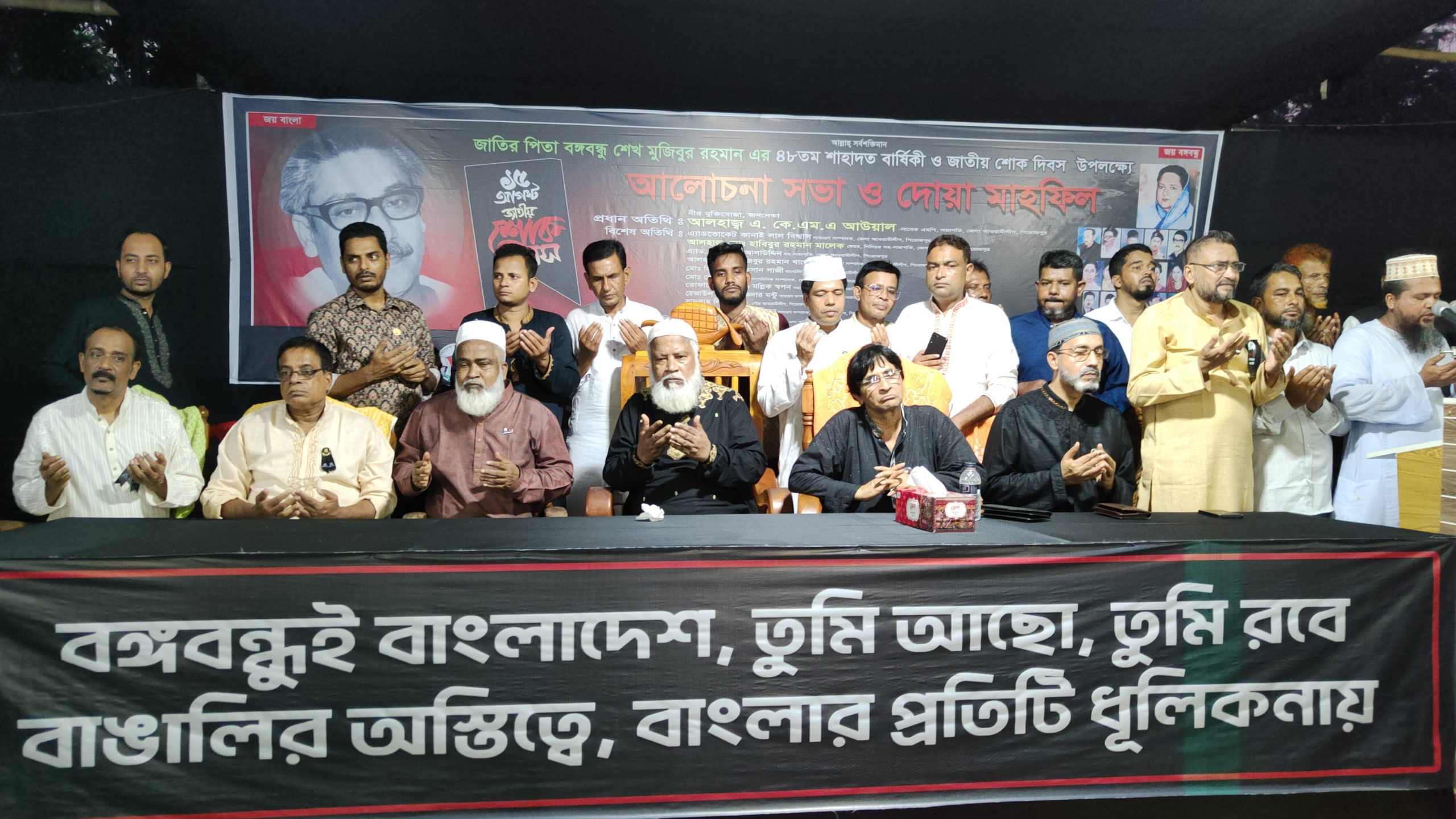 আলোচনা সভা শেষে জাতির পিতা ও তার পরিবারের শহীদ সদস্যদের রুহের মাগফিরাত কামনায় দোয়া ও মোনাজাত করা হয়। দোয়া।