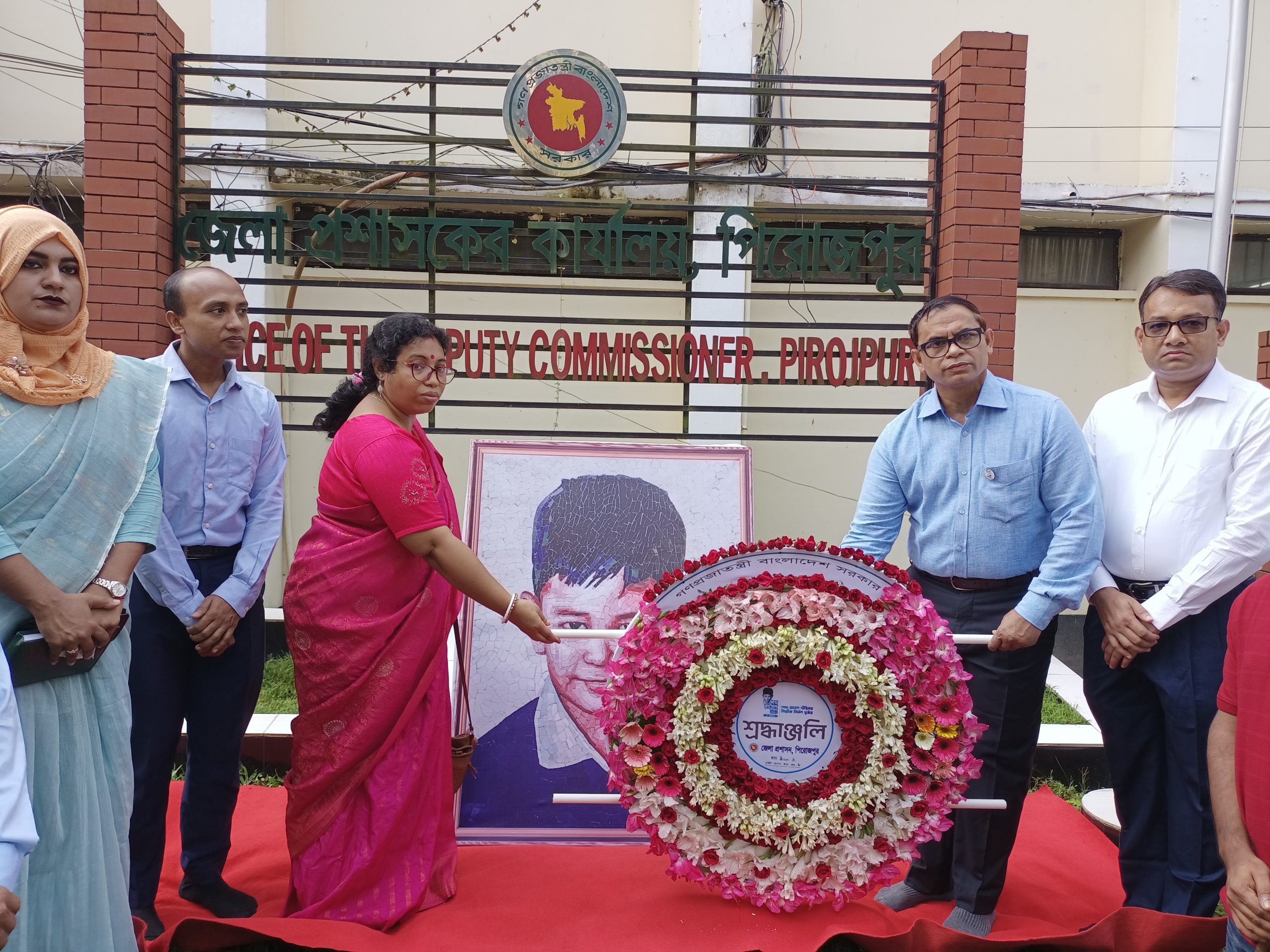 সারাদেশের ন্যায় নানা আয়োজনে পিরোজপুরে শেখ রাসেল দিবস পালিত হয়েছে। আজ বুধবার সকাল ৯টায় একটি সার্কিট হাউজ থেকে একটি র্যালী বের হয়ে বিভিন্ন সড়ক প্রদক্ষিণ করে। পরে জেলা প্রশাসক কার্যালয়ে শেখ রাসেল এর প্রতিকৃতিতে পুষ্পমাল্য অর্পণ করেন জেলা প্রশাসক মোহাম্মদ জাহেদুর রহমান, অতিরিক্ত পুলিশ সুপার শেখ মোস্তাফিজুর রহমান, অতিরিক্ত জেলা প্রশাসক মাধুবী রায়, জেলা আওয়ামীলীগের সাধারণ সম্পাদক এ্যাড. কানাই লাল বিশ্বাস, জেলা শিল্পকলা একাডেমীর সাধারণ সম্পাদক জিয়াউল আহসান গাজী। এসময় জেলা আওয়ামীলীলীগ, যুবলীগ, বিভিন্ন সরকারি বেসরকারি কর্মকর্তাবৃন্দ, বিভিন্ন সামাজিক ও রাজনৈতিক ব্যাক্তিবর্গ শেখ রাসেল এর প্রতিকৃতিতে পুষ্পমাল্য অর্পণ করেন।