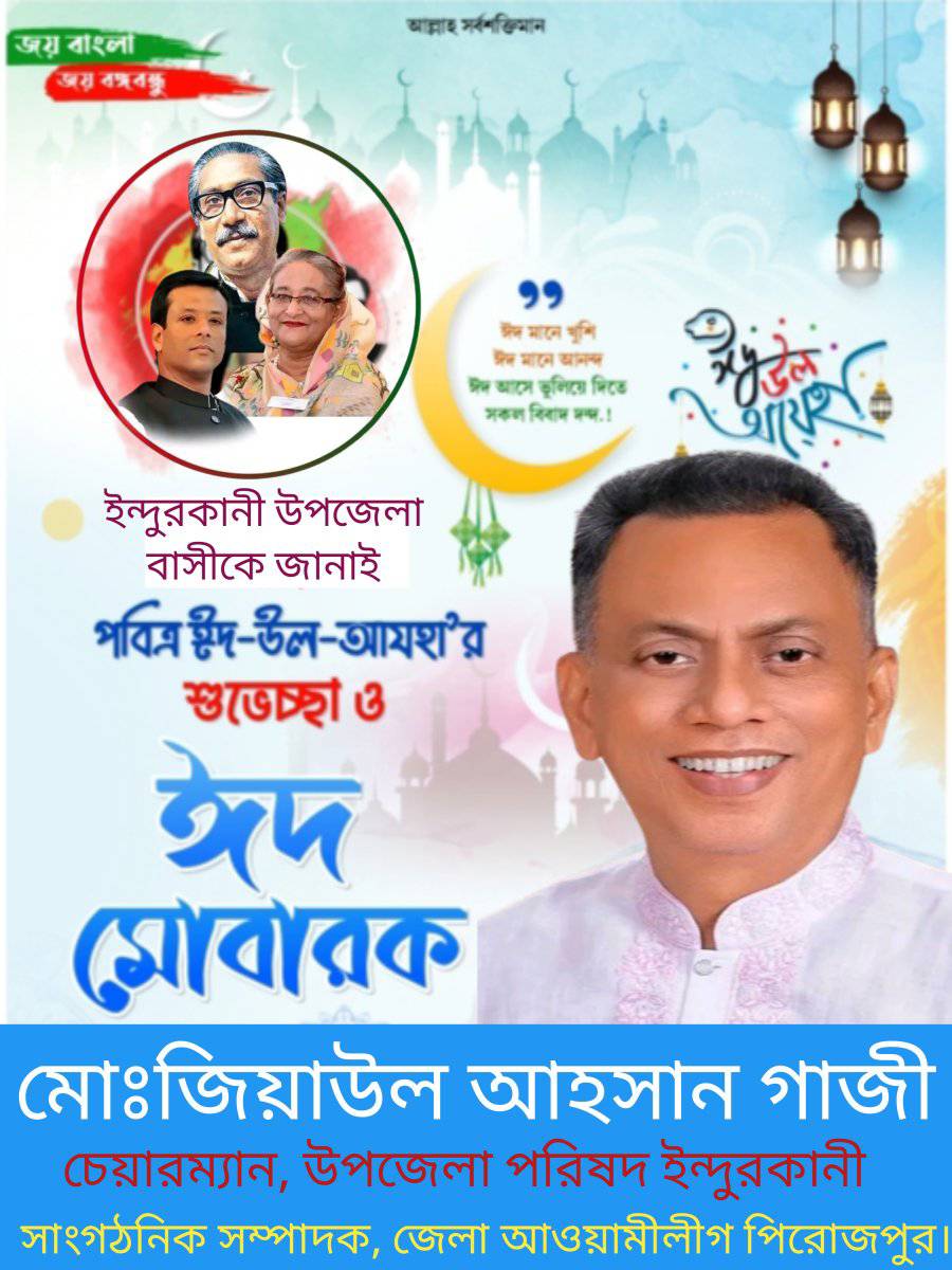 এক বার্তায় ইন্দুরকানী উপজেলার নব নির্বাচিত উপজেলা চেয়ারম্যান ও পিরোজপুর জেলা আওয়ামীলীগের সাংগঠনিক সম্পাদক জিয়াউল আহসান গাজী জানান আসন্ন পবিত্র ঈদ-উল- আযহা উপলক্ষে ইন্দুরকানী উপজেলার সকল স্তরের মানুষদের আন্তরিক শুভেচ্ছা ও অভিনন্দন জানিয়েছেন। তিনি আরো বলেন মহান আল্লাহর আশীর্বাদে জীবনে সুখ, সমৃদ্ধি ও আনন্দ নিয়ে আসুক। এই ঈদ-উল- আযহা সবার জীবনে বয়ে আনুক অনাবিল সুখ-শান্তি-সমৃদ্ধি ও অফুরন্ত আনন্দ।