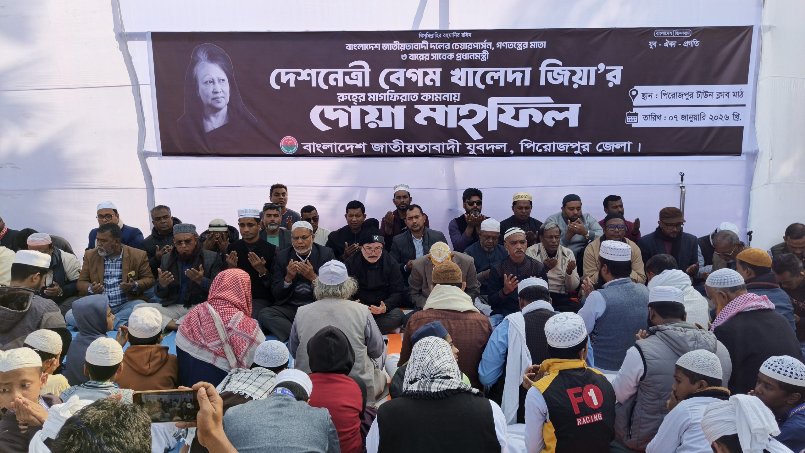 বিএনপি’র চেয়ারপার্সন বেগম খালেদা জিয়ার রুহের মাগফিরাত কামনায় পিরোজপুরে জেলা যুবদলের আয়োজনে দোয়া মাহফিল অনুষ্ঠিত হয়েছে। আজ বুধবার দুপুরে পিরোজপুর জেলা যুবদলের আয়োজনে পিরোজপুর টাউন ক্লাব মাঠে এ দোয়া মাহফিল অনুষ্ঠিত হয়।