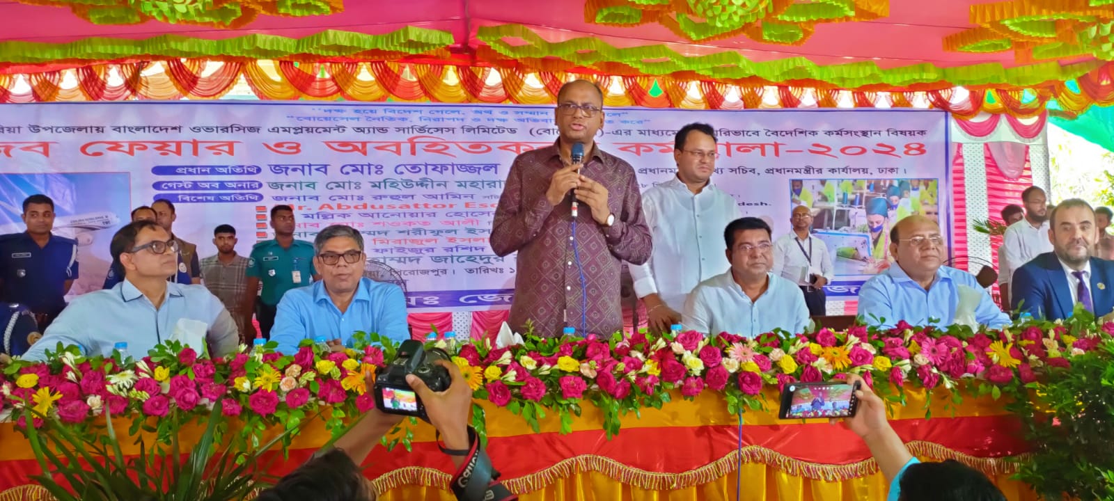পিরোজপুর থেকে বিনা অভিবাসন ব্যয়ে জর্ডানে চাকরির সুযোগ পাওয়া শতাধিক নারীকর্মীকে তাদের কর্ম সংক্রান্ত অবহিতকরন কর্মশালা অনুষ্ঠিত হয়।প্রবাসী কল্যাণ ও বৈদেশিক কর্মসংস্থান মন্ত্রণালয় অধীনে বাংলাদেশ ওভারসিজ এমপ্লয়মেন্ট অ্যান্ড সার্ভিসেস লিমিটেডের (বোয়েসেল) আওতায় পিরোজপুরের ভান্ডারিয়া উপজেলা পরিষদ চত্ত্বর প্রাঙ্গনে আজ বুধবার বেলা ১১টায় জব ফেয়ারের মাধ্যমে এই কর্মশালা অনুষ্ঠিত হয়। সেলাইয়ে প্রশিক্ষণ প্রাপ্ত বিদেশগমনেচ্ছু এসব নারী কর্মীদের বোয়েসেলের আয়োজনে আইওএম এর সহযোগিতায় অনুষ্ঠিত এ কর্মশালায় প্রধান অতিথি হিসেবে উপস্থিত ছিলেন প্রধানমন্ত্রীর মুখ্য সচিব মো: তোফাজ্জল হোসেন মিয়া। অনুষ্ঠানে গেস্ট অব অনার পিরোজপুর-২ আসনের সংসদ সদস্য মো. মহিউদ্দিন মহারাজ।