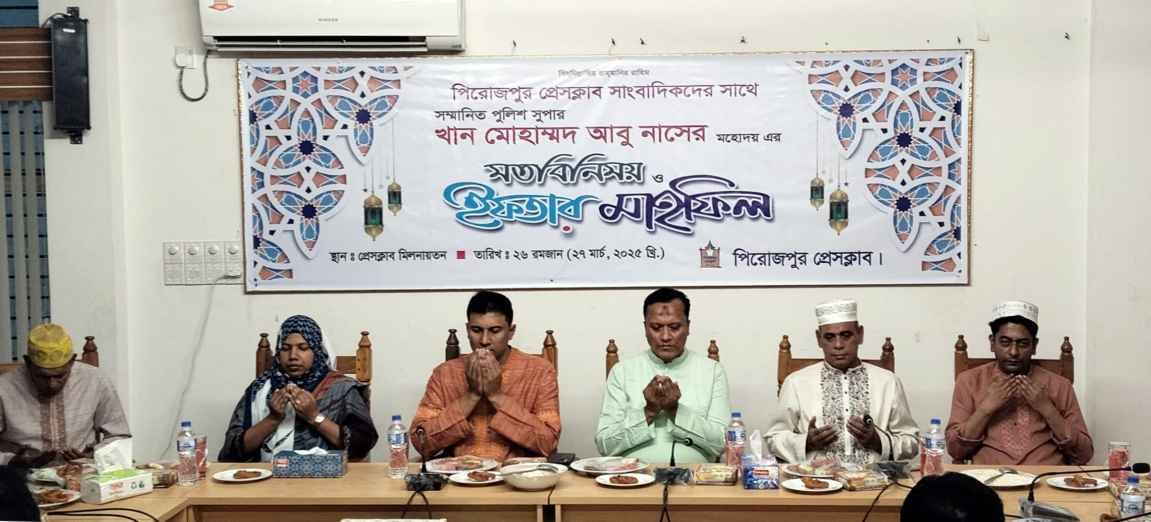 ইফতার পূর্ব মতবিনিময় সভায় পিরোজপুর প্রেসক্লাব সভাপতি এস এম রেজাউল ইসলাম শামীমের সভাপতিত্বে প্রধান অতিথি হিসেবে বক্তব্য রাখেন পিরোজপুরের পুলিশ সুপার খান মোহাম্মদ আবু নাসের। পিরোজপুর প্রেসক্লাব সাধারন সম্পাদক এস এম তানভীর আহমেদের সঞ্চালনায় আরো বক্তব্য রাখেন অতিরিক্ত পুলিশ সুপার (প্রশাসন ও অর্থ) শেখ মোস্তাফিজুর রহমান , অতিরিক্ত পুলিশ সুপার (সদর সার্কেল ) নাসরিন জাহান সহ সাংবাদিকবৃন্দ।