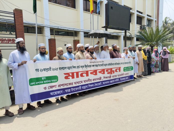 মানববন্ধনে বক্তব্য রাখেন সংগঠনের জেলা সভাপতি মাওলানা মো. নুরুল আমিন, সাধারণ সম্পাদক মাওলানা মো. ইমাম হোসেন, শিক্ষক নেত্রী নুসরাত জাহানসহ অন্যান্য নেতৃবৃন্দ।