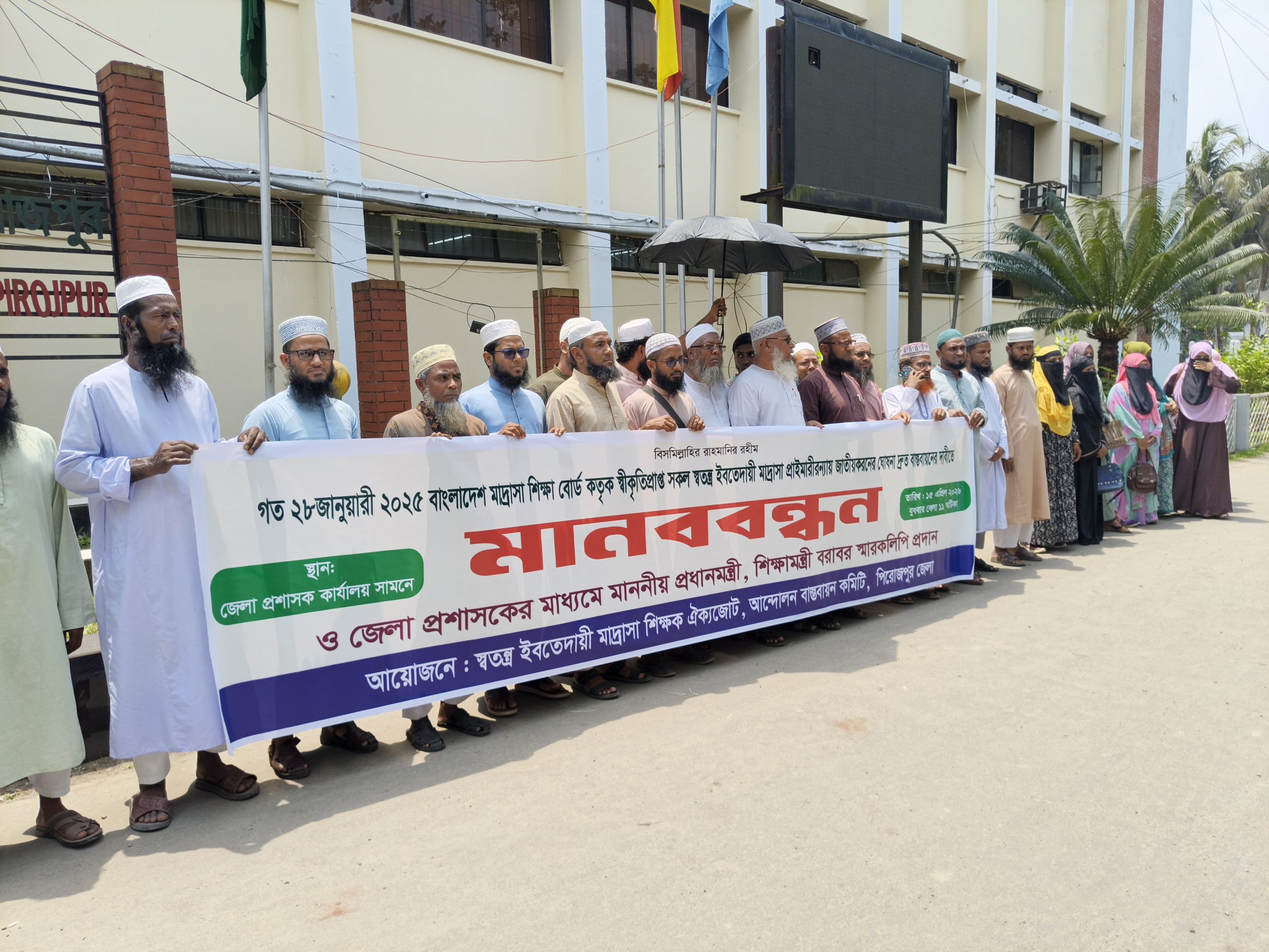 পিরোজপুরে স্বতন্ত্র ইবতেদায়ী মাদ্রাসা জাতীয়করণের দাবিতে মানববন্ধন ও স্মারকলিপি প্রদান করা হয়েছে। বুধবার বেলা ১২ টার দিকে জেলা প্রশাসকের কার্যালয়ের সামনে স্বতন্ত্র ইবতেদায়ী মাদ্রাসা শিক্ষক ঐক্যজোটের উদ্যোগে ঘণ্টাব্যাপী এ মানববন্ধন কর্মসূচি পালিত হয়।