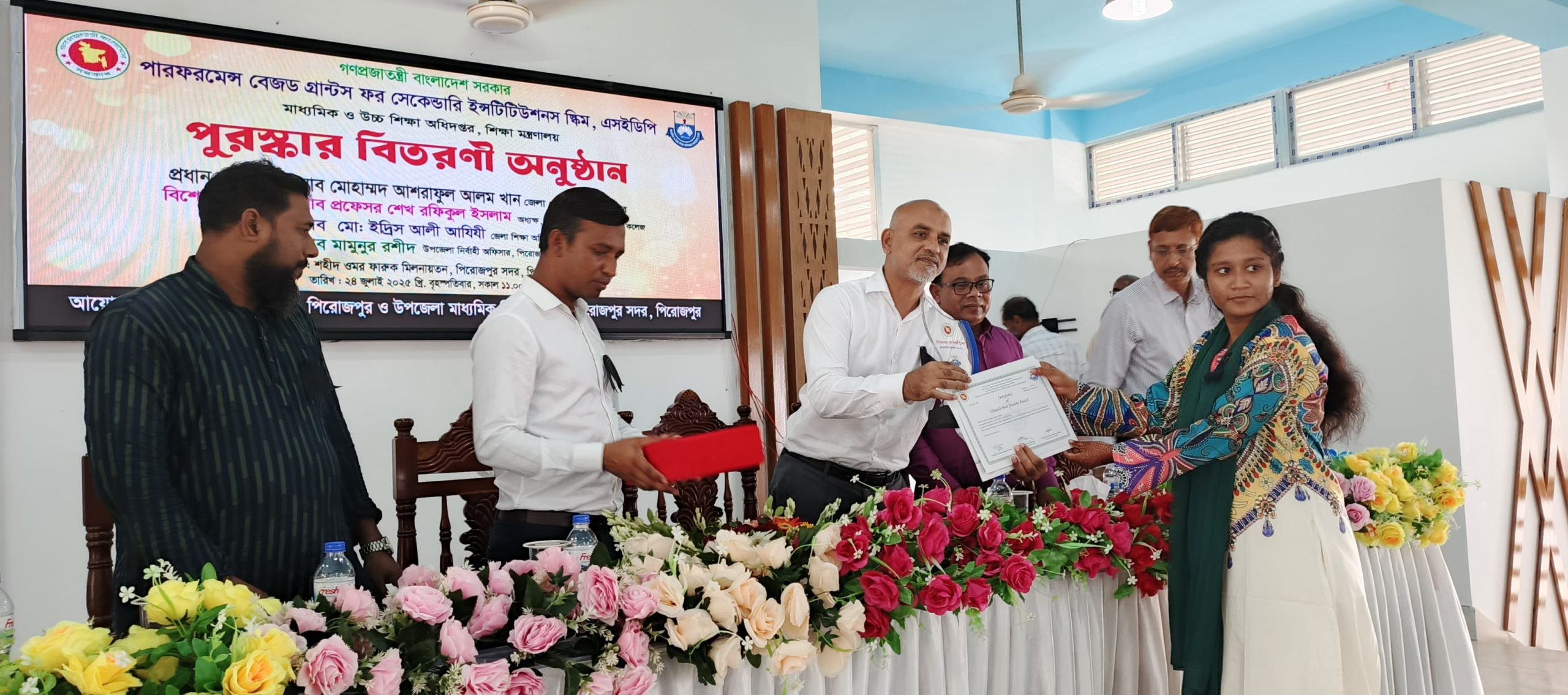 পিরোজপুর প্রতিনিধি : গণপ্রজাতন্ত্রী বাংলাদেশ সরকারের মাধ্যমিক ও উচ্চশিক্ষা অধিদপ্তরের পারফরমেন্স বেজড ফর সেকেন্ডারি ইন্সটিটিউশনস স্কিম এর আওতায় ২০২২-২৩ সালে এসএসসি ও এইচএসসি পরীক্ষায় সর্ব্বোচ্চ নম্বর পাওয়া পিরোজপুর সদর উপজেলার ৩৭ জন মেধাবী শিক্ষার্থীর মাঝে পুরস্কার বিতরন করা হয়েছে। বৃহস্পতিবার (২৫ জুলাই) দুপুরে পিরোজপুর সদর উপজেলা অডিটরিয়ামে জেলা ও উপজেলা মাধ্যমিক শিক্ষা অফিসের আয়োজনে এ পুরস্কার বিতরন করেন জেলা প্রশাসক মোহাম্মদ আশরাফুল আলম খান।