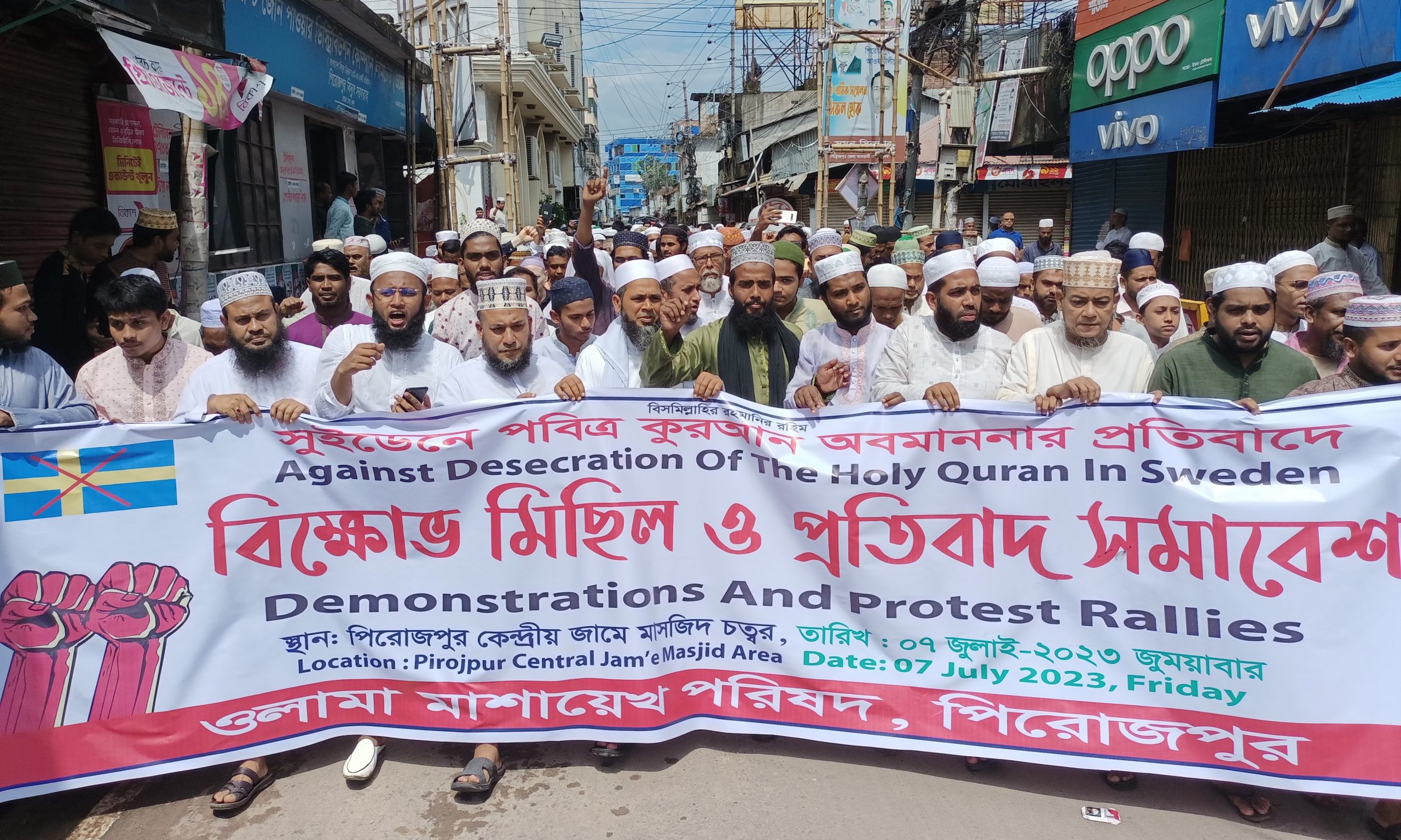 এসময় পিরোজপুরের ধর্মপ্রান মুসল্লিরা সুইডেনে পবিত্র কুরআন অবমাননা করার তিব্র নিন্দু ও প্রতিবাদ জানান। মুসল্লিরা সরকারের কাছে বাংলাদেশ থেকে সুইডেনের পন্য বর্জনের দাবী জানান তারা। পবিত্র কোরআনের অবমাননায় প্রতিটি মুসলমানের হৃদয়ে রক্তক্ষরণ হচ্ছে। কেবল মুসলমান নয় পৃথিবীর কোনো ধর্মপ্রাণ মানুষ ধর্মের অবমাননা মেনে নিতে পারে না। কেবল বাংলদেশ নয়, গোটা বিশ্বের মুসলমানরা এই কোরআনের অবমাননায় ক্ষুব্ধ। দেশের শতকরা ৯৩ শতাংশ মানুষ মুসলমান। তাই সুইডেনের রাষ্ট্রদূতকে তলব করে প্রতিবাদ করার জোর দাবি জানাচ্ছি।